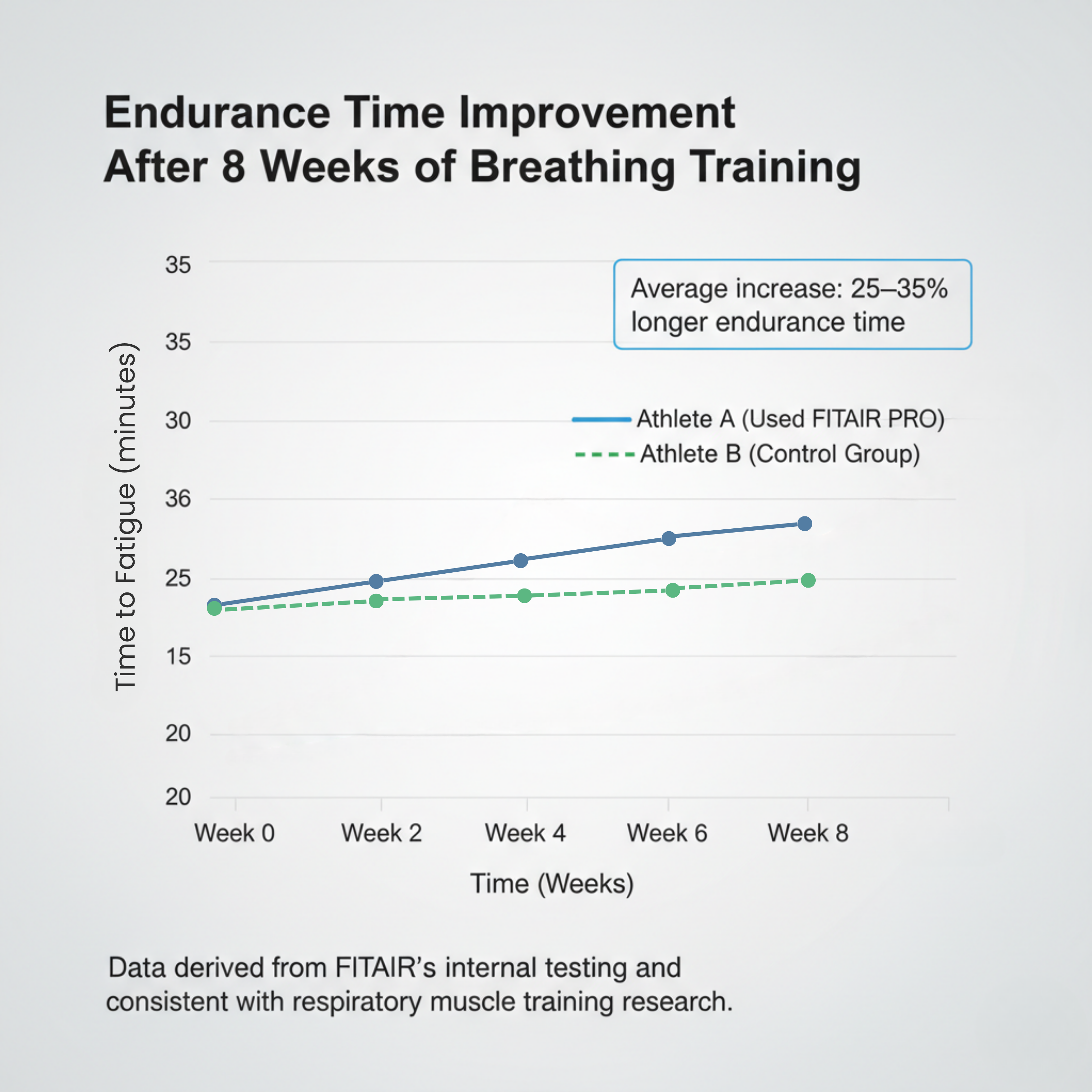 Both groups trained identically — but only one added FITAIR PRO. By strengthening the respiratory muscles, Athlete A extended endurance by up to 35%, proving that smarter breathing leads to stronger performance.